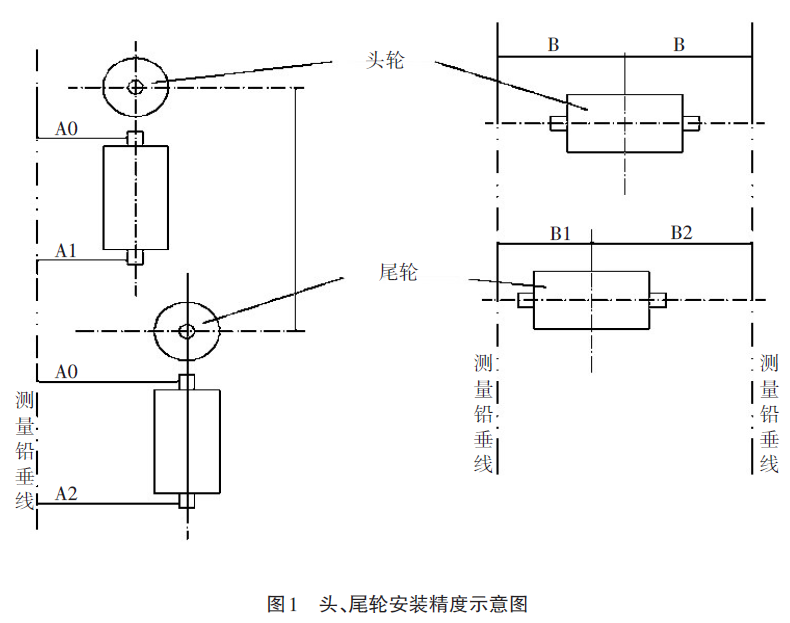 提升機(jī)全部安裝完畢后,頭、尾輪軸水平度允差≤0.3/1000,同時(shí)應(yīng)符合圖1和表2的規(guī)定。