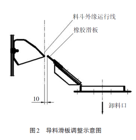 為控制物料回流,在提升機(jī)頭部出料口設(shè)置了一個(gè)可調(diào)節(jié)的橡膠滑板,在料斗安裝完后,調(diào)整橡膠滑板外緣使它與料斗外緣運(yùn)行線之間的距離為10mm,將其緊固(見圖2)。