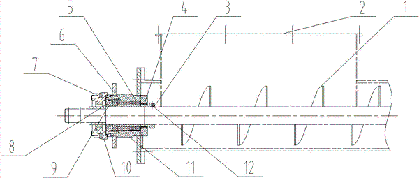 本技術(shù)新型涉及 螺旋輸送機 輸送領(lǐng)域,具體屬于應(yīng)用于食品、化工、醫(yī)藥、糧食行業(yè)的螺旋輸送機防漏粉軸承密封裝置。 背景技術(shù): 在化工、食品、醫(yī)藥、糧食行業(yè),物料都需要有距離的輸送,螺旋輸送機是在這種情況下常用的輸送方式?,F(xiàn)有的螺旋輸送機在使用時,常出現(xiàn)兩端密封座因密封不嚴(yán),密封端物料泄露嚴(yán)重漏料,泄漏物滲入軸承內(nèi),就會造成螺旋輸送機運轉(zhuǎn)一段時間軸承座的軸承便會卡死。同時也會造成物料浪費,污染環(huán)境。 技術(shù)實現(xiàn)要素: 本技術(shù)的目的是提供一種螺旋輸送機防漏粉軸承密封裝置,為化工、醫(yī)