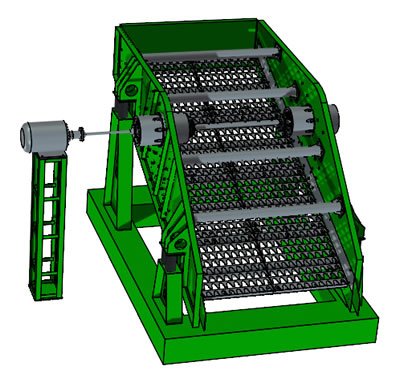 單軸振動篩有一個十分牢靠的篩箱,因為其結(jié)構(gòu)是焊接及鉚接而成,在振動器的主軸上不僅中間位置有偏心軸,而且主軸兩頭也有能夠調(diào)節(jié)的偏心輪。在篩分時,電動機經(jīng)由三角帶作用于振動器,傳動軸使偏心軸及偏心輪產(chǎn)生慣性力,這種慣性力會令篩箱作近似的圓形的運動,使物料得到了佳的篩分效果。